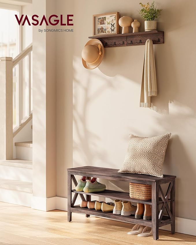VASAGLE, Entryway Storage Bench, 2-Tier Shoe Rack, 11.8 x 39.4 x 18.9 Inches, Holds up to 600 lb, Farmhouse Style, for Living Room, Bedroom, Maroon Brown ULSB153K51