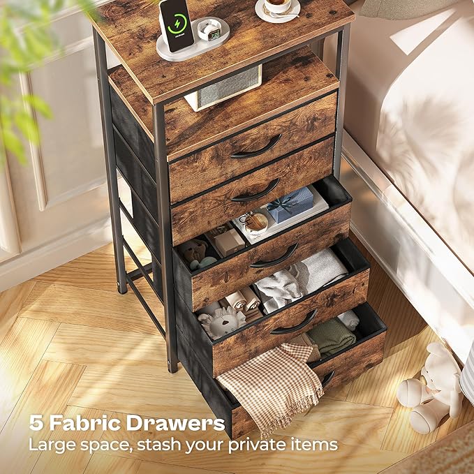 Huuger 5 Drawers Dresser with Charging Station, Set of 2, Dresser for Bedroom, Tall Night Stand, Chest of Drawers with Open Shelf, Bedside Table Nightstand, Fabric, Rustic Brown