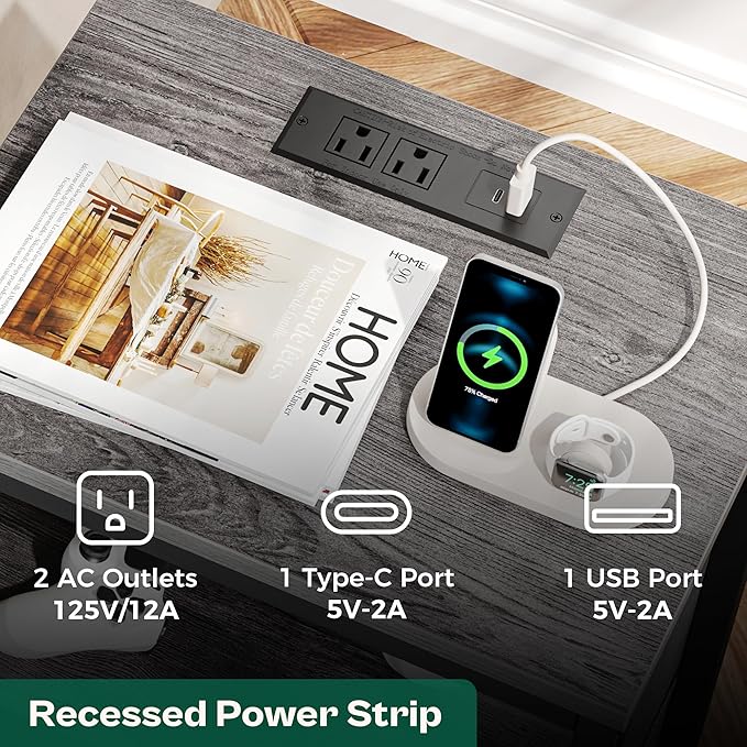 - 【Nightstand with Outlets】Add 2 AC outlets,1 USB port and 1 Type-C port, more charging spots for bedtime, plug in your phones and turn on your lamps, this nightstand with drawer will comfort your bedtime with convenient charging. Plus: Contain patent pending drawer slide
