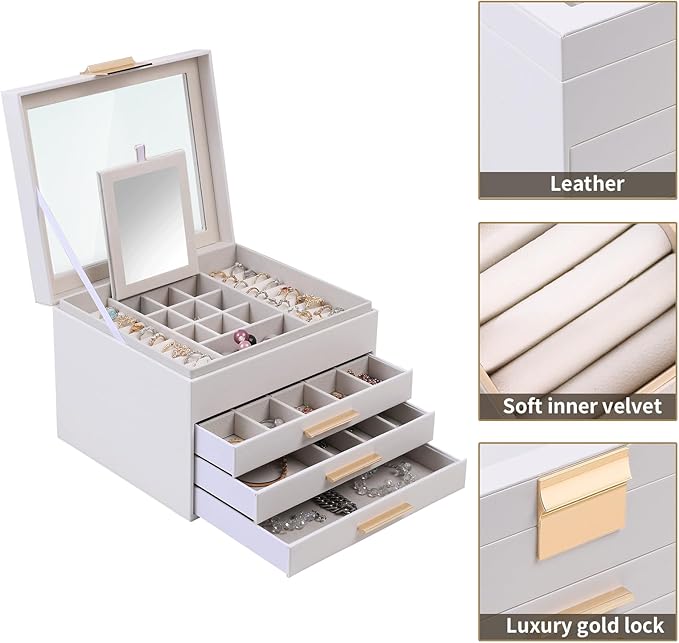 BOOVO Clear Lid Jewelry Box,4 Layers Jewelry Organizer Large Jewelry Storage Box with 3 Drawers,Jewelry Holder Organzier of Rings Earrings Necklace Bracelets for Women (White, 4 Layer)