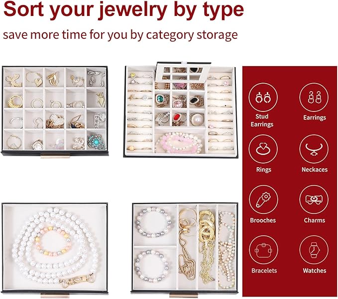 - 【 Space Saving Jewelry Rack 】 : With our jewelry display box, all your jewelry will be in good order and easy to reach. From then on, you have a bright dresser that saves space and makes your room look neater and more elegant. In addition, our jewelry travel boxes are designed to categorize your jewelry at a glance, shortening search time.