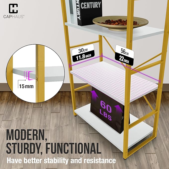 - 📋 High Quality Bookshelf - CAPHAUS Bookshelf is constructed with premium metal and P2 Grade particle board, the contemporary metal bookshelf is solid, stable, sturdy and durable. With the metal frame and 15mm thick wooden board, each shelf can be loaded up to 60 lbs. There are X-shaped support rods make the bookshelf more stable and can protect the items. The board size is 22” L x 11.8” W, which helps maximize the storage space.