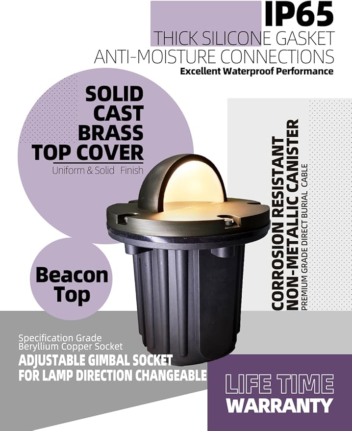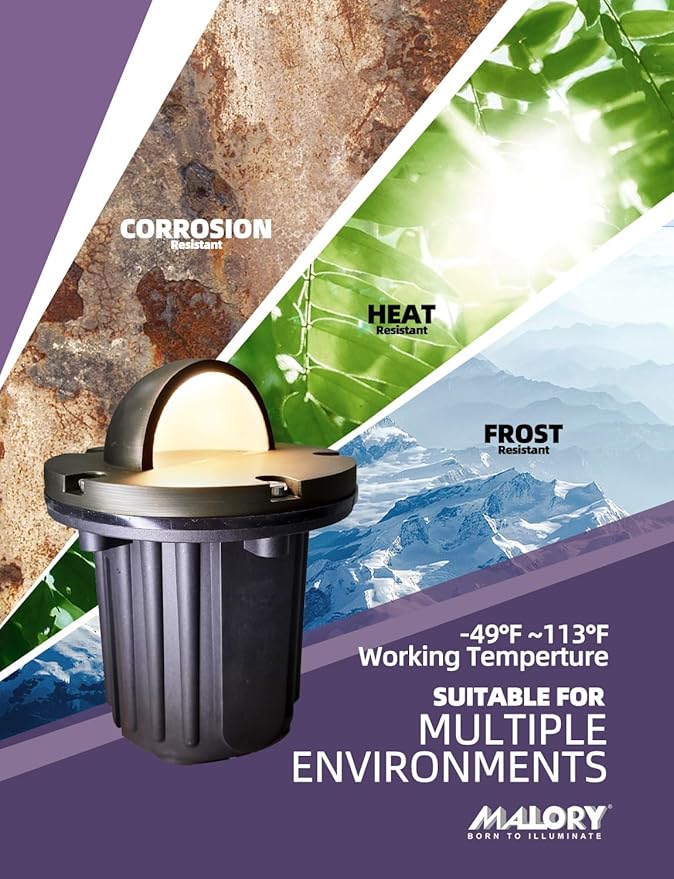 - MALORY in-ground well lights are made of die-cast brass top and high quality PVC embedded part for any outdoor environment use. IP65 waterproof rating and -49℉⁓113℉ working temperture,without worrying about rain, snow, frost, high temperature, and other bad weather.