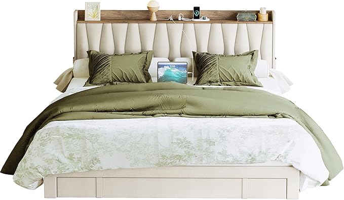 - Storage Headboard with Charging Station: The king size bed frame combines a storage headboard with a charging function for your convenience. You can put your glasses, photos on the shelf; also charge your phone, laptop within reach