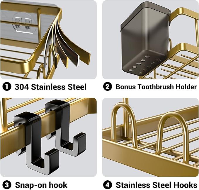 - [Premium Material & Package Contents]: Corner shower organizer is made of stainless steel, coated with rustproof paint and the solid frame wire is much more thickened than old version shower caddies. Package included: 2 x corner shower caddy, 4 x adhesive, 4 x plastic hook, 2 x toothpaste holder.