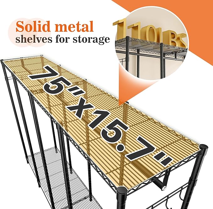 - 【Clothes Rack 1100Lbs Bearing Capacity】Dimensions: 75" H x 75" W x 15.7" D, Load capacity: 1100 lbs. The clothing rack has 10 shelves and 4 hanging rods, which can hang about 250-300 summer clothes or 80-100 winter clothes. Single hanging rod can support up to 75 lbs, wire shelf can support up to 88 lbs for each.