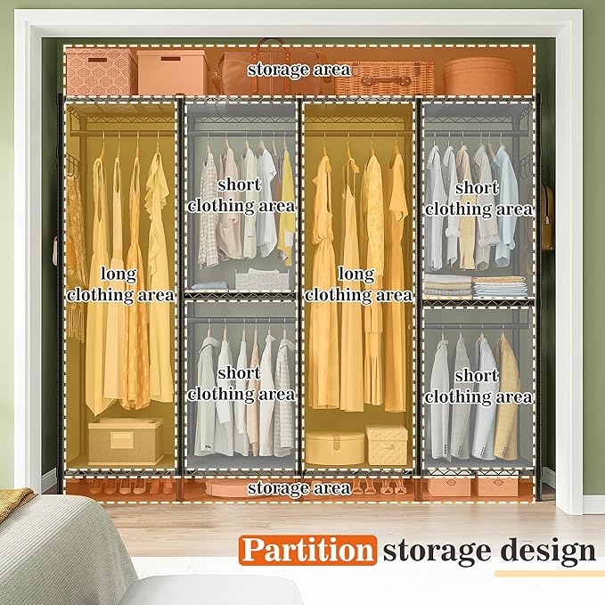 - 【Simple Garment Rack Easy to Assemble】The clothes hanger rack is designed with slip-sleeve locking system, you can adjust wire shelves easily. Easy to install it by following instruction(usually takes just 20-30 minutes), no bolts, screws or nuts are needed.