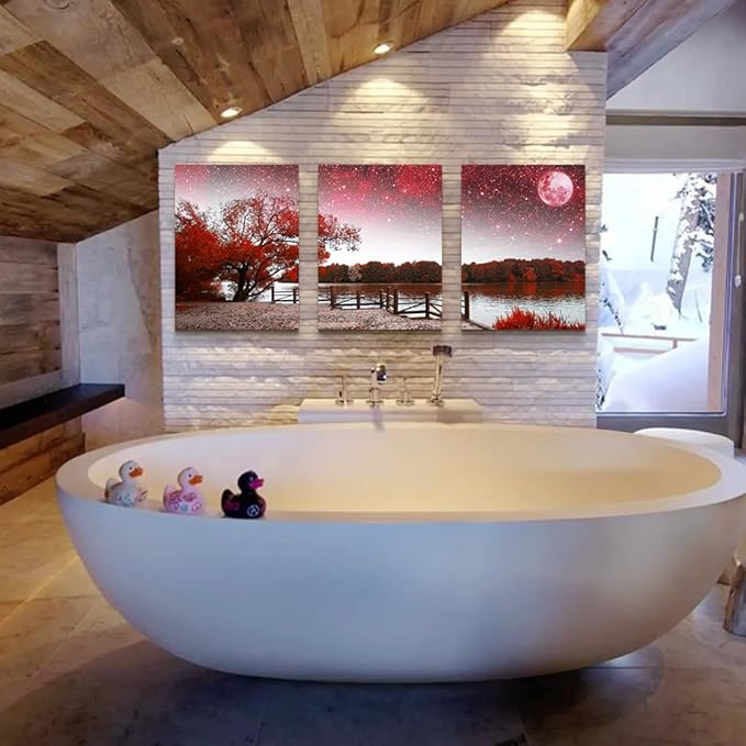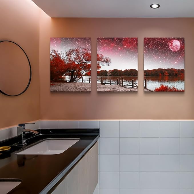Wall Art Decor Poster Living Room Abstract Red Tree Moon Starry Sky Red Landscape Paintings Bathroom Wall Art Bedroom Canvas Prints Works 3 Pieces Picture Ready To Hang Office Home Decoration Artwork