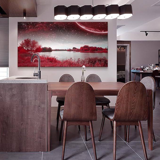 Print Artwork Wall Art Decor Poster For Living Room Red Tree Moon Starry Sky Red Landscape Painting Bathroom Wall Art For Bedroom Canvas Prints Picture Works Ready To Hang Office Home Decorations