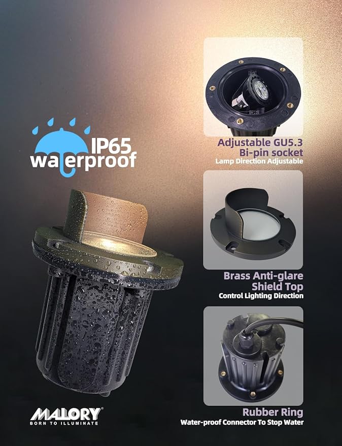 - MALORY in-ground well lights are made of die-cast brass top and high quality PVC embedded part for any outdoor environment use. IP65 waterproof rating and -49℉⁓113℉ working temperture,without worrying about rain, snow, frost, high temperature, and other bad weather.