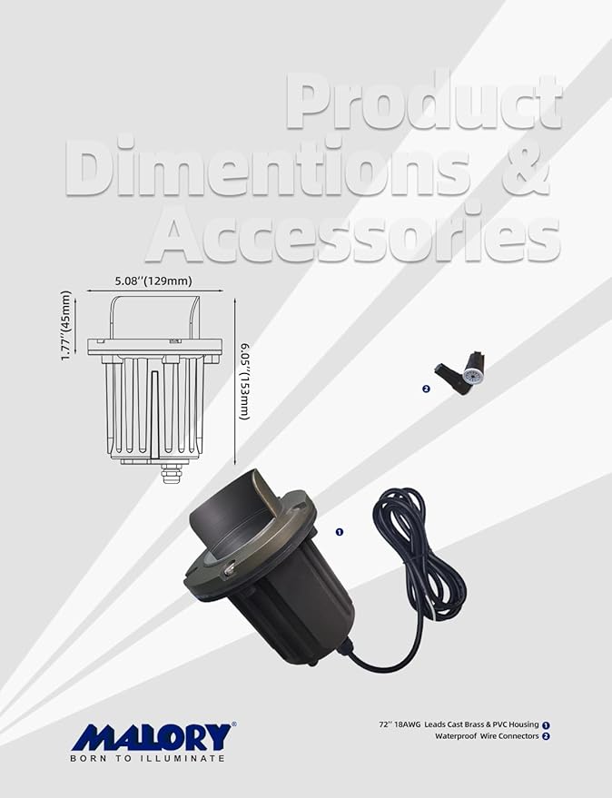 - MALORY in-ground well lights are made of die-cast brass top and high quality PVC embedded part for any outdoor environment use. IP65 waterproof rating and -49℉⁓113℉ working temperture,without worrying about rain, snow, frost, high temperature, and other bad weather.