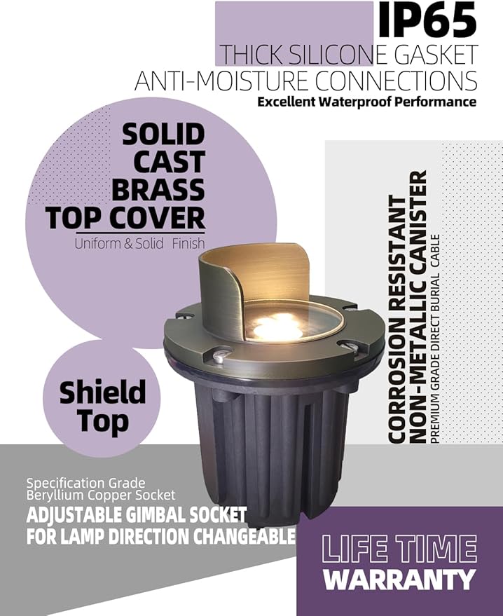 - MALORY in-ground well lights are made of die-cast brass top and high quality PVC embedded part for any outdoor environment use. IP65 waterproof rating and -49℉⁓113℉ working temperture,without worrying about rain, snow, frost, high temperature, and other bad weather.