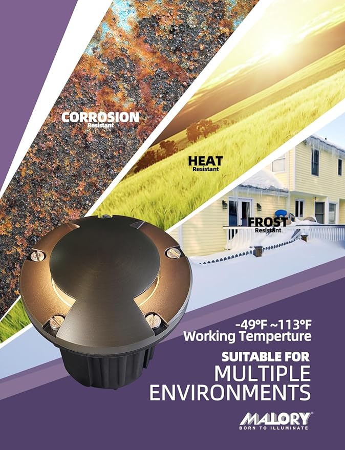 - MALORY in-ground well lights are made of die-cast brass top and high quality PVC embedded part for any outdoor environment use. IP65 waterproof rating and -49℉⁓113℉ working temperture,without worrying about rain, snow, frost, high temperature, and other bad weather.