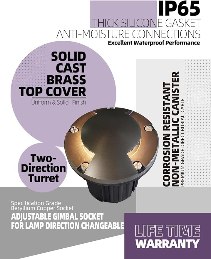 - MALORY in-ground well lights are made of die-cast brass top and high quality PVC embedded part for any outdoor environment use. IP65 waterproof rating and -49℉⁓113℉ working temperture,without worrying about rain, snow, frost, high temperature, and other bad weather.