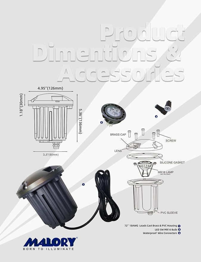 - LIFETIME WARRANTY:MALORY landscape lighting are built to the highest standards of construction and performance, we extends an industry-best lifetime warranty on its brass fixtures and 50,000 hrs for the LED bulbs.Please contact us if you have any issue, we will offer top rated customer service for you.