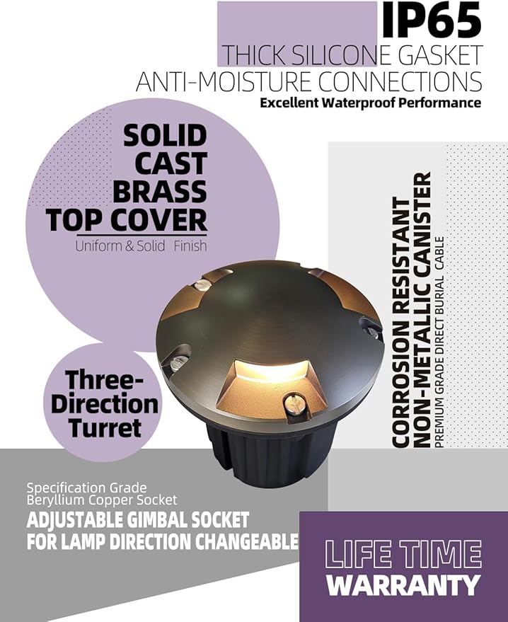 - MALORY in-ground well lights are made of die-cast brass top and high quality PVC embedded part for any outdoor environment use. IP65 waterproof rating and -49℉⁓113℉ working temperture,without worrying about rain, snow, frost, high temperature, and other bad weather.