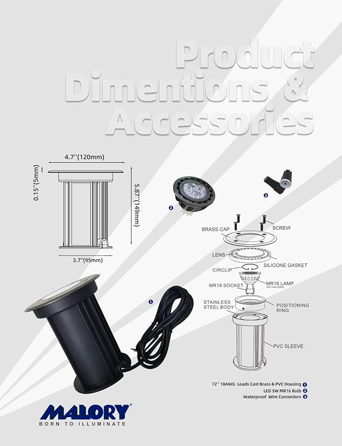 - MALORY in-ground well lights are made of die-cast brass top and high quality PVC embedded part for any outdoor environment use. IP65 waterproof rating and -49℉⁓113℉ working temperture,without worrying about rain, snow, frost, high temperature, and other bad weather.