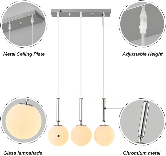 - 【Stylish Modern Design】This mid century pendant light kitchen island adds classic feel and glamour to any space, with milk white globe glass shade and metal ceiling canopy in chrome finish adds elegance and luxury to your house.