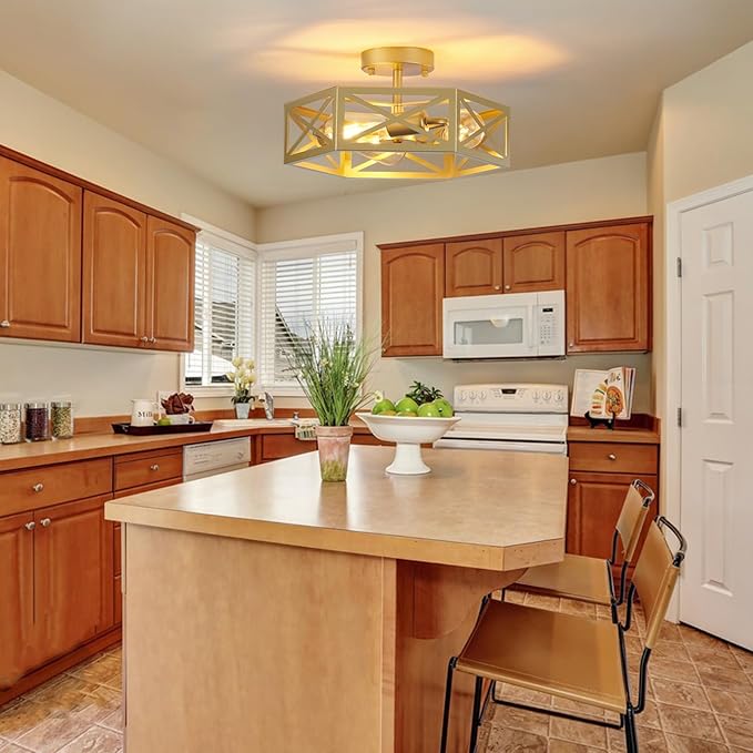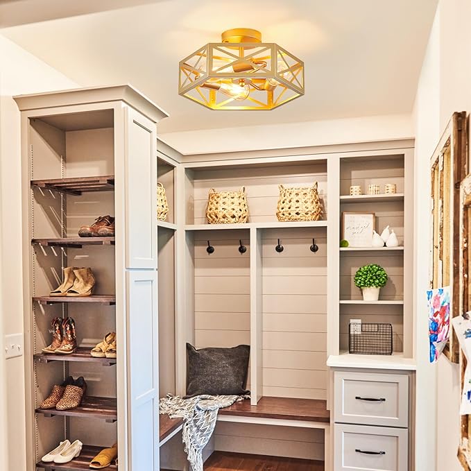 - 【Modern Ceiling Light】The gold flush mount ceiling light fixture features a hexagonal metal cage in a gold finish, bringing a beautiful rustic, yet modern farmhouse appeal to its simple and stylish design. The open design and no glass allows the exposed bulbs to shine brightly, making it easier for you to change the bulbs.
