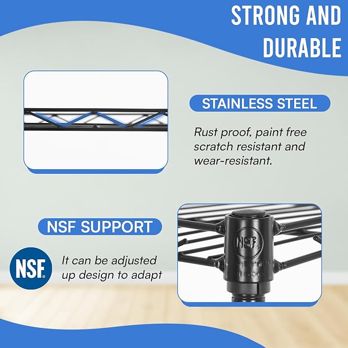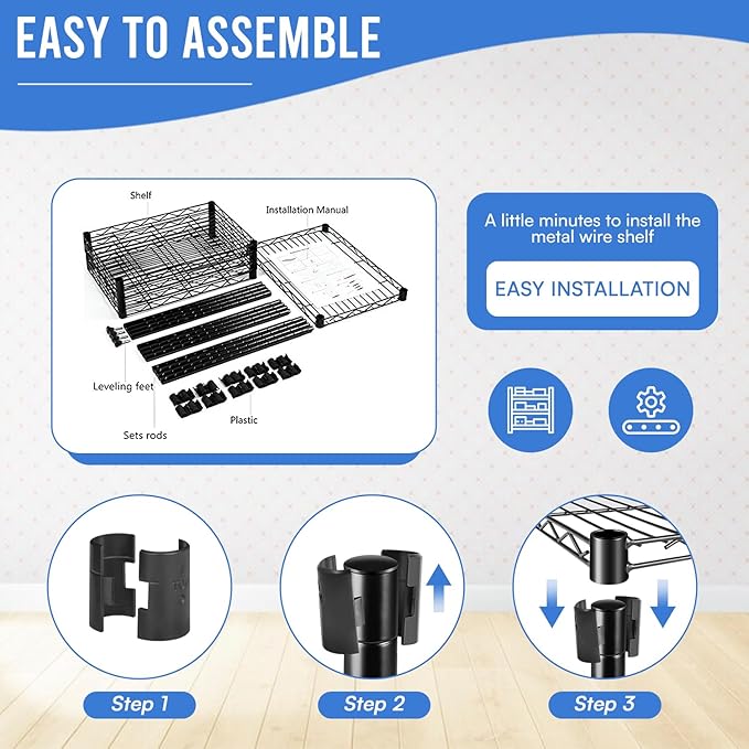 - 5.**Easy Assembly:** Assembly is a breeze with clear instructions and minimal hardware for our shelves. No need for complicated tools or extensive DIY skills; you can have this shelf set up quickly and effortlessly. Enjoy the convenience of hassle-free assembly and start organizing your space in no time with this metal shelving.