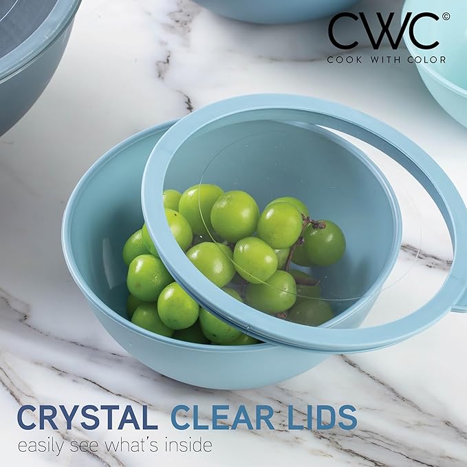 COOK WITH COLOR Mixing Bowls with Non Slip Bottom - 12 Piece Plastic Nesting Bowls Set includes 6 Prep Bowls and 6 Tritan Lids - Microwave Safe (Blue)