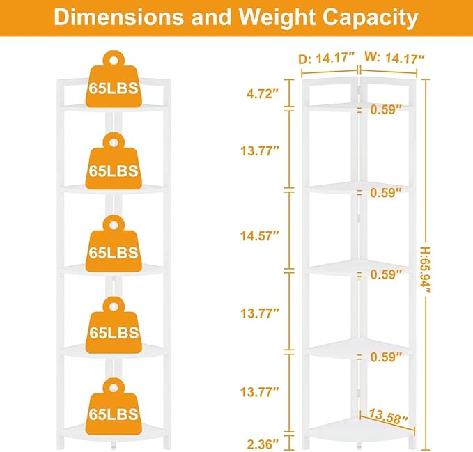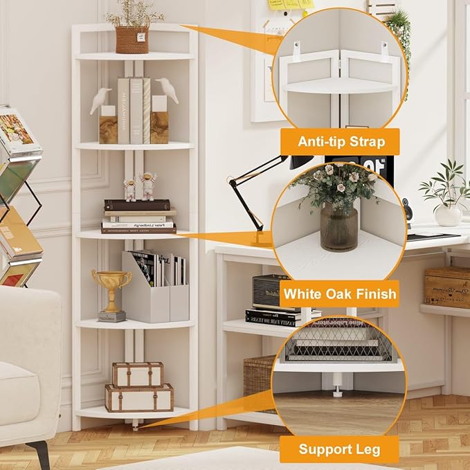 - [Fill the Empty Corner]: This tall corner shelf features 5 open shelves and provides ample storage space to maximize your room. It’s the perfect platform to display framed family photos, plants, or rows of your favorite reads. It also comes with sturdy structure and an additional support leg under the bottom shelf, which greatly enhances stability