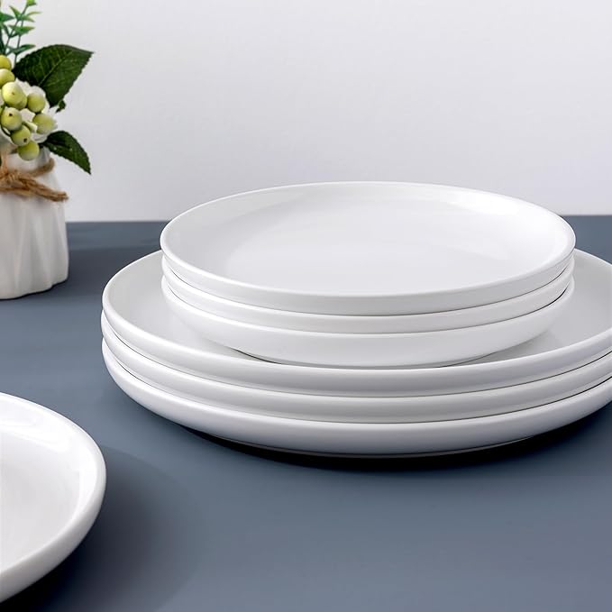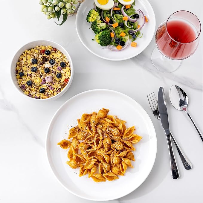 - 【SCRATCH RESISTANT】The unique round shape design makes them easy to stack and they stack well without taking up much space. Made of durable stoneware, this durable dinnerware set adopts a glossy sturdy, and durable scratch-resistant glaze, which can resist scratches from knives and forks. Each piece is lightweight yet sturdy, ensuring that it can withstand everyday use without chipping or breaking.