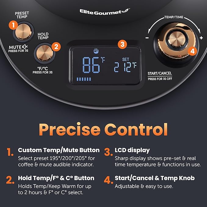 - ELEGANT, BEAUTIFUL & CLASSIC DESIGN: The Elite Gourmet 1L Gooseneck Digital, Hot Water Kettle is a premium, cordless electric kettle designed for pour-over coffee and other hot beverages & foods that require hot water. You will appreciate its stylish, black matte finish with copper accents that gives any kitchen a classy bistro vibe.