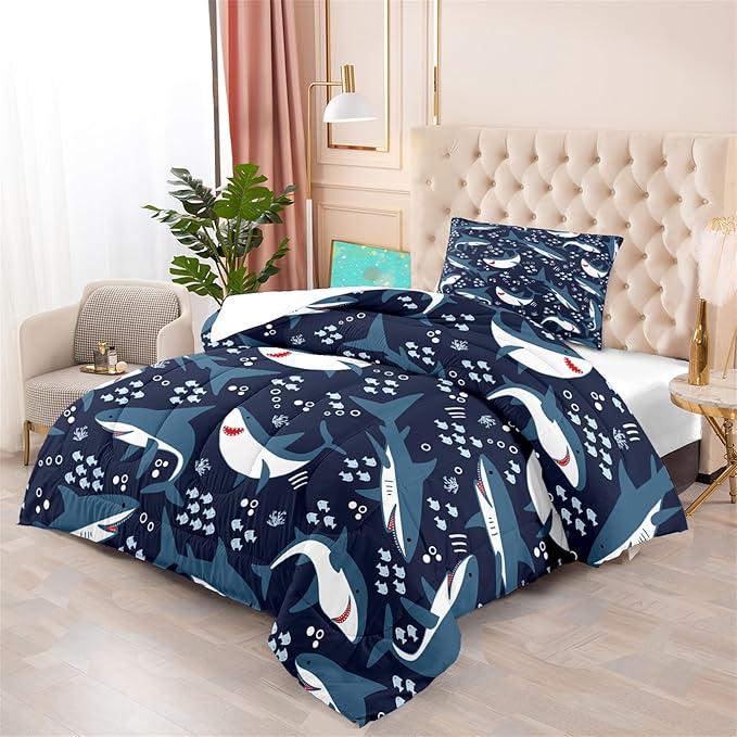 - MATERIAL: Made of high-quality material. The Shark Twin Bedding Sets for Boys filling is high-quality polyester. The soft and fluffy Shark quilt keeps you warm and cozy in all seasons.