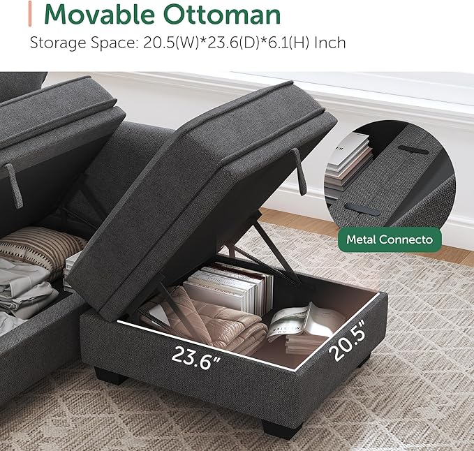- Movable Ottoman: The sectional couch is composed of a 4 seat sofa and 2 movable ottoman. Ottomans can be connected to the 4 seat sofa by connecting pieces to form a U shaped sofa. Ottomans can also be placed individually according to your needs