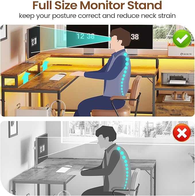 SEDETA L Shaped Office Desk, 66" Corner L Shaped Computer Desk with File Drawer & Power Outlet for Home Office, Gaming Table with Led Lights, Monitor Shelf, Printer Storage Shelves, Rustic Brown