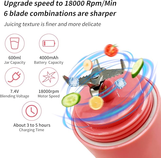 - 【High Speed & Larger Capacity Blender】Our portable blender adopts 270W powerful motor allows your single blender for shakes and smoothies. Low working noise, 20oz (600ml) large-capacity personal blender allows you to make as many delicious drinks as possible at one time. A one-button action, 6 stainless blade which can easily and quickly crush ice cubes, mash vegetables and fruits to make delicious drinks only 30 seconds.