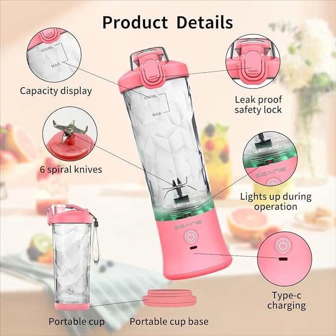 Portable Blender, Personal Blender for Shakes and Smoothies with 20 Oz Travel Cup and Lid, Mini Personal Size Blender with 6 Blades and USB Rechargeable for Gym, Kitchen and Outdoors (Pink)