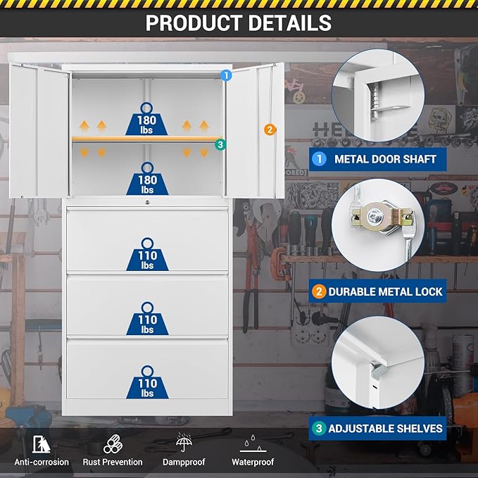 - MULTI-FUNCTIONAL AND DURABLE - The whole cabinet is all made of metal, and the metal shelves above the cabinet can bear about 180 pounds of weight; The metal drawer below can hold about 110 pounds.You can put it in different places such as office, living room, garage, warehouse, etc. It can completely meet your needs.