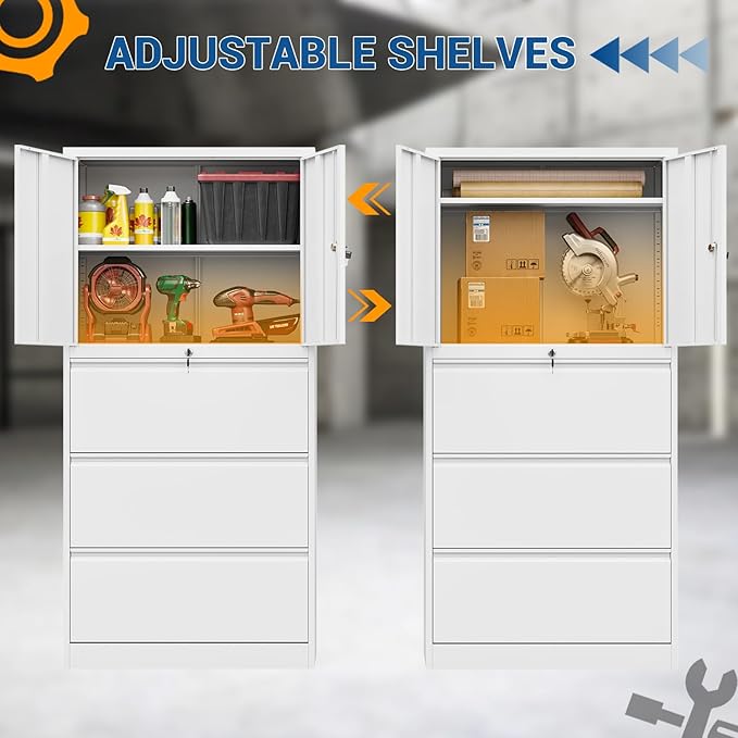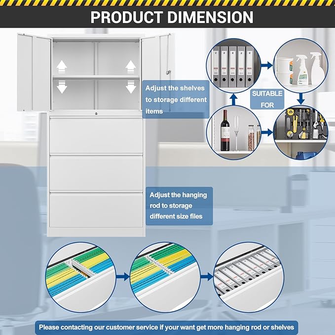 - LARGE STORAGE SPACE - There has a adjustable metal shelves inside the cabinet, which is suitable for storing toolbox, storage box, documents and sundries, etc. The size of the metal drawer is H11.8*W30*D14.8 IN; There has an adjustable metal hanging bar inside the drawer to store Letter/Legal/F4/A4 documents. If you need to store other types of articles or documents, you can remove the metal hanging bar to get more storage space.