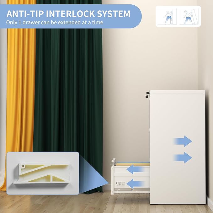 - ◉【Lockable & Secure】All the drawers of file cabinet can be locked by one lock, when one drawer of the metal file cabinet is opened, the anti-tilt and interlocking system prevents the other drawer from opening, ensuring your safety.