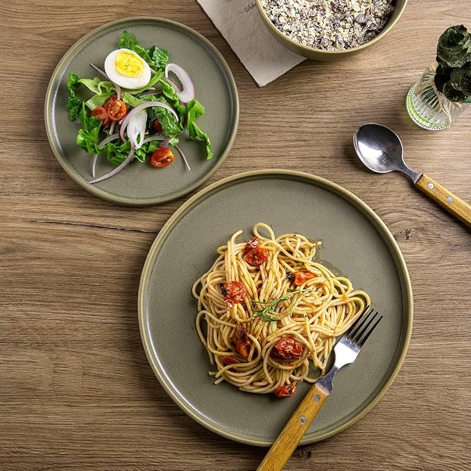 - EVERY PLATE IS UNIQUE: Our plates are fired with two different glazes, so the surface develops a beautiful color and makes your food look even more delicious. The reactive glaze makes every plate unique. Since our glaze is all-natural, it tends to change color depending on the lighting. The color may be a tad different from what you see on your screen.Our glaze is also extra strong to prevent scratches from your knives and forks.
