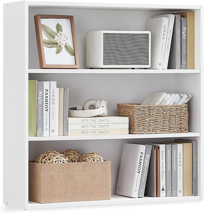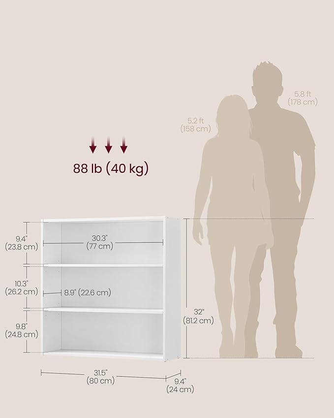 - 【SPACE-SAVING & ADJUSTABLE】This 3-tier bookcase, measuring 9.4"D x 31.5"W x 32"H, optimizes vertical space. The 2nd and 3rd tiers are adjustable to 3 heights (up or down 1.2"), easily accommodating tall books, artwork, or storage boxes