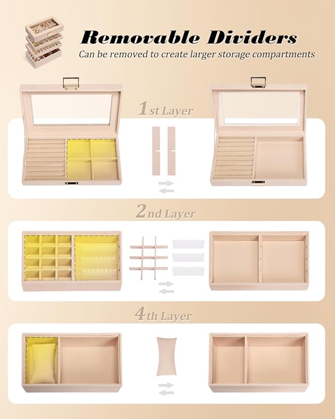 - Practical Layout: The first layer includes a ring storage and four removable compartments; the second layer includes 12 removable compartments and three acrylic earring card slots; the third layer is a necklace tray with curved design to prevent tangling; the fourth layer features a long removable watch pillow and glasses compartment