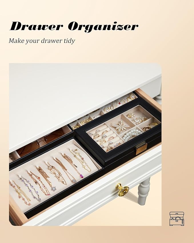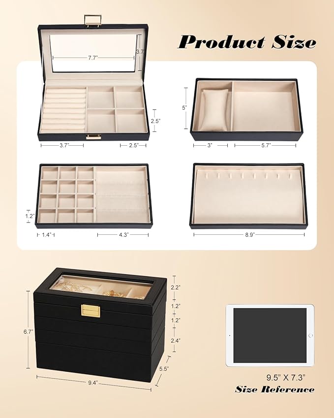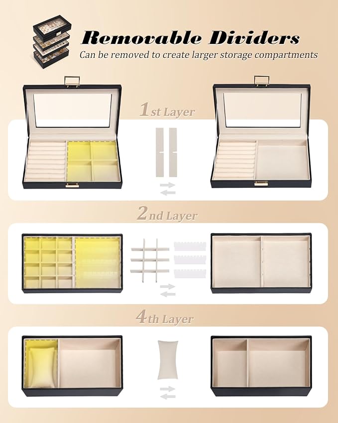 - Practical Layout: The first layer includes a ring storage and four removable compartments; the second layer includes 12 removable compartments and three acrylic earring card slots; the third layer is a necklace tray with curved design to prevent tangling; the fourth layer features a long removable watch pillow and glasses compartment