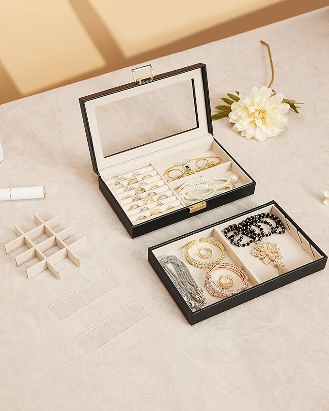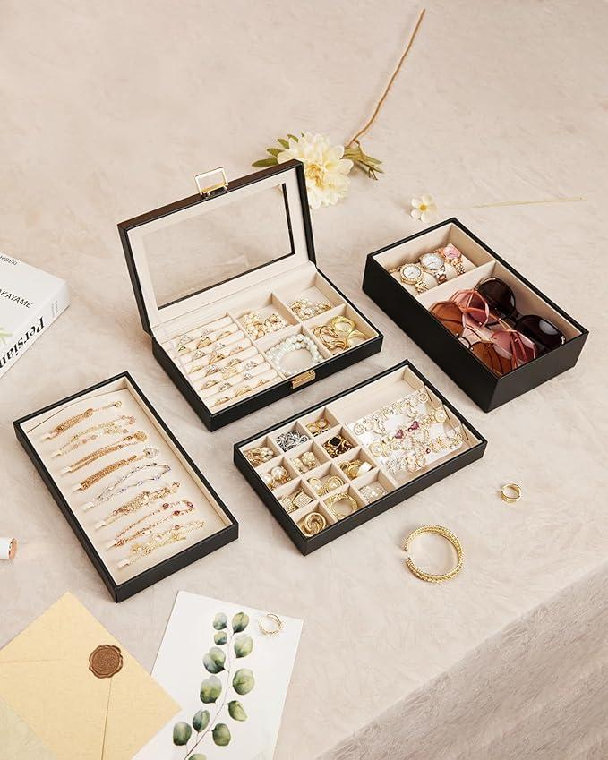 Homde Jewelry Tray Stackable Jewelry Box Drawer Organizer with Glass Lid, Removable Dividers for Vanity Table Gift Idea for Girls and Women (Black)