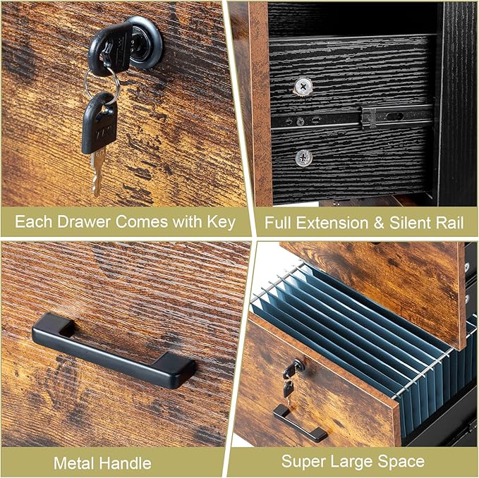 - 【Ample File Drawers】VINGLI rustic brown & black locking file cabinet with 2 drawers is costomized for letter/A4 size folders with tabs. The reinforced stainless steel hanging rods make it sturdy enough to bear folders full loaded free of bending