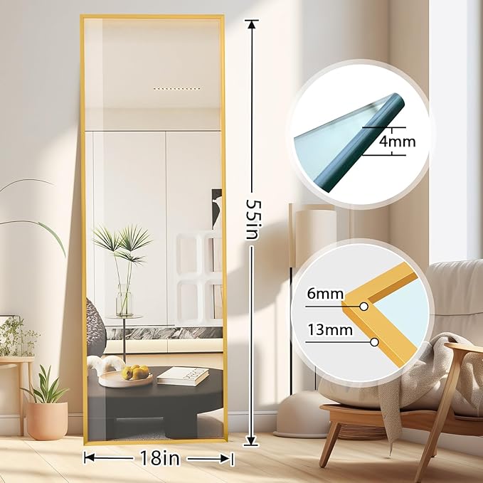 - Attractive Appearance: Its sleek gold aluminum alloy frame adds a modern, sophisticated touch and ensures no out-of-shape, no rust and anti-corrosion while the floor-length design allows you to fully admire your outfit. Whether you choose to hang this mirror on the wall or lean it against a wall, it will instantly make your bedroom or dressing room feel more spacious and luxurious