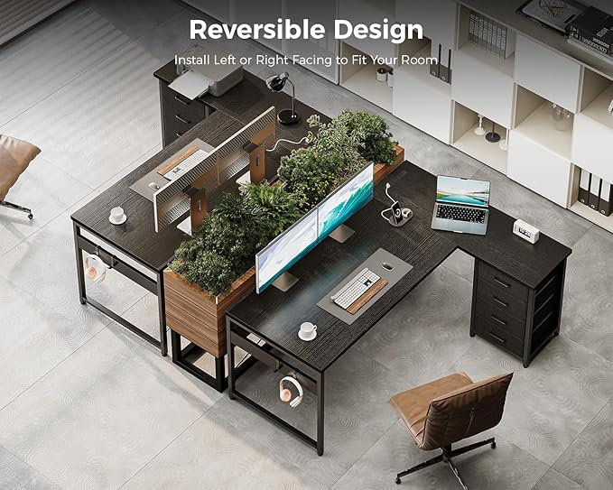 - 【Optimized Storage Space】Featuring 4 spacious drawers and 2 sturdy iron hooks, this L-shaped desk maximizes organization by effortlessly accommodating documents, stationery, and personal items. Its thoughtful design keeps your workspace uncluttered, while the ample surface area supports your printer, scanner, and more, ensuring everything is conveniently at hand.