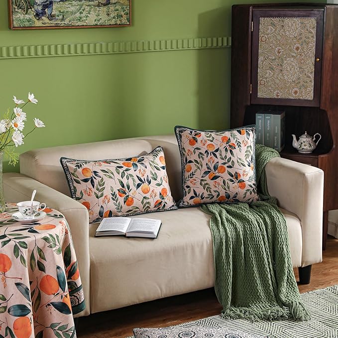 patdrea Designer Throw Pillow Covers Set of 2,Square Green Vintage Rustic Linen with Oranges Harvest Pattern Pillow Cover,Decorative Pillowcases Cushion for Bed Living Room Outdoor Car,18"x18"