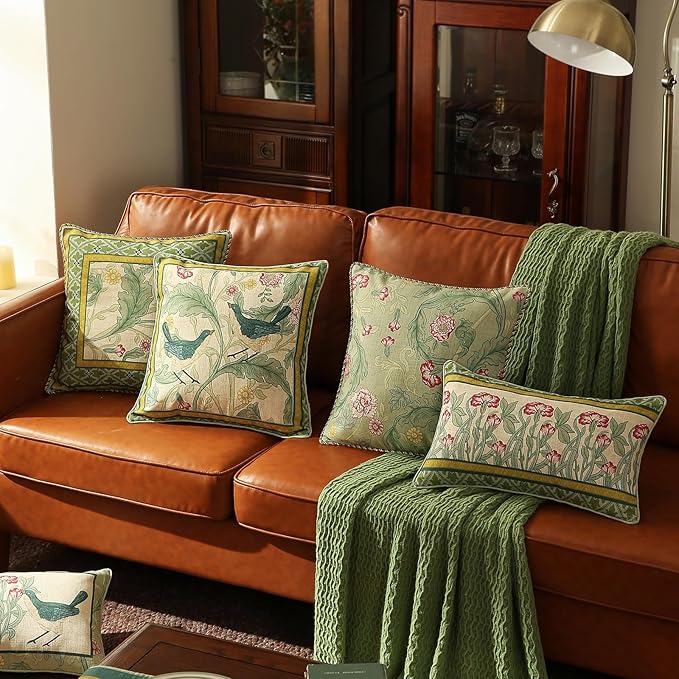 patdrea Designer Pack of 2 Rectangle Throw Pillow Covers,French Vintage Rustic Linen with Green Floral Pattern Pillows Cover,Decorative Lumbar Pillowcases Cushion for Bed Living Room,12"x20"