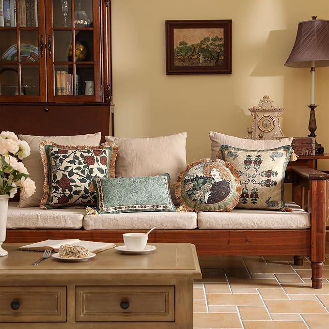 patdrea Designer Throw Pillow Covers Set of 2,French Elegant Green Linen with Curly Grass and Floral Pattern Pillow Covers,Decorative Lumbar Pillowcases Cushion for Bed Living Room Outdoor,12"x20"