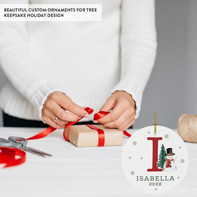Andaz Press Personalized Ornament, Custom Name, Initial I Monogram Snowman 2.8" Ceramic Porcelain 2025 Christmas Ornament Keepsake for Kids, Boys, Girls, Includes Gold Ribbon & Gift Box, 1-Pack