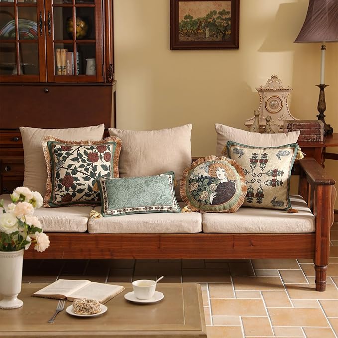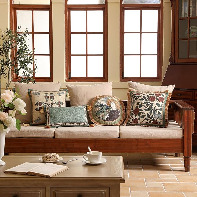 patdrea Designer Throw Pillow Covers Set of 2,French Elegant Green Linen with Rose and Animal Floral Pattern Pillow Covers,Decorative Square Pillowcases Cushion for Bed Living Room Outdoor,18"x18"