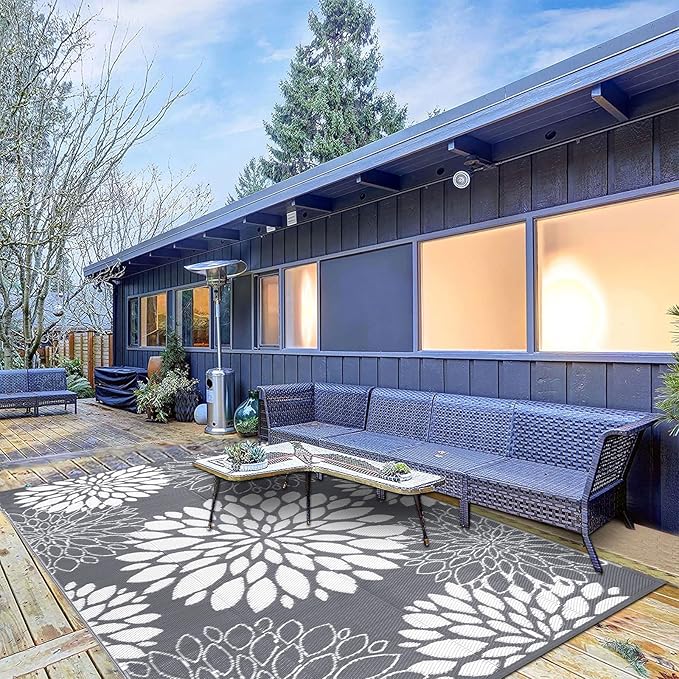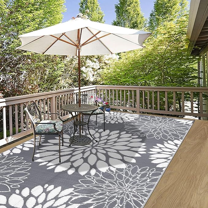 Ileading Reversible Outdoor Rug 5x8Ft Waterproof Patio Rug Carpet Portable Outdoor Plastic Straw Rug Large RV Camping Mat Rug for Patio, Clearance, Deck, Beach, Porch, Camping, Picnic, Flower Grey